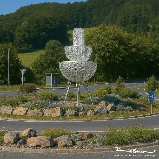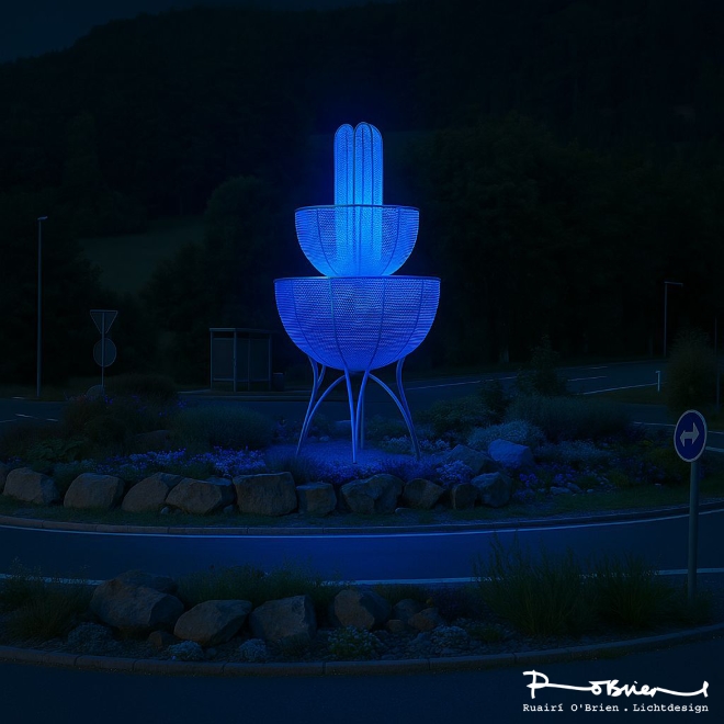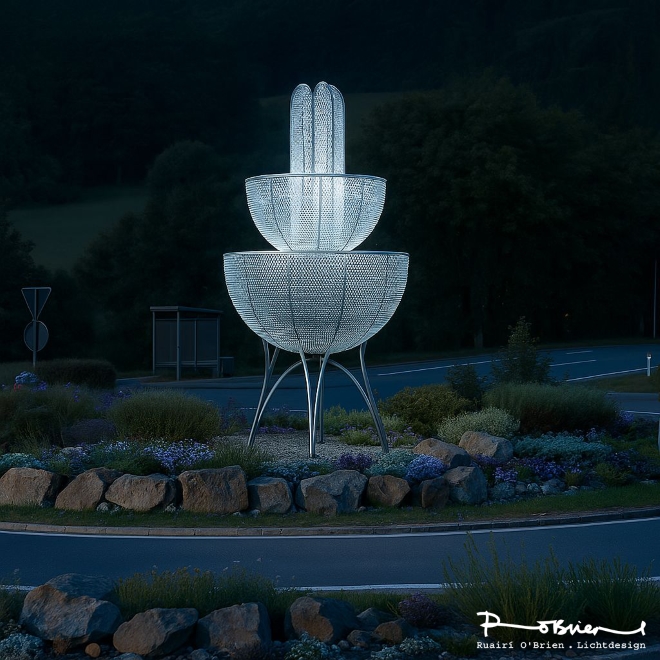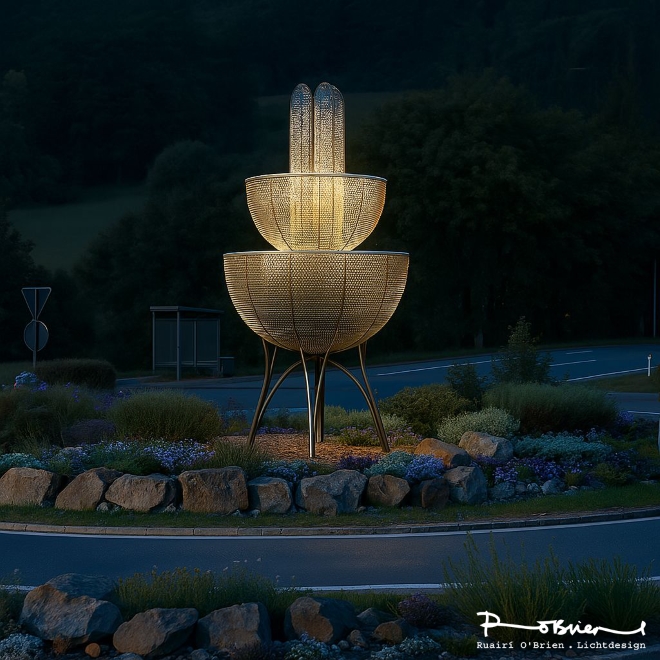 As the focal point within the roundabout, the sculpture organizes movement and space. It is more than an object: it is an expression of hospitality, quality, and contemporary design in the public realm. The light sculpture visibly enhances the spa town, uniting art, architecture, and light into a distinctive symbol that endures — as the first image of arrival and as a mark of identity that remains in memory.