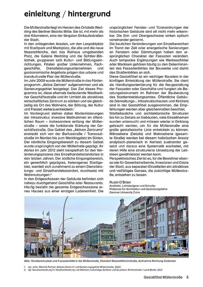This design guide is an important building block in the future development of Müllerstrasse. It serves as a guideline for action for the redesign of facades or stores and functions as an advisory tool within the framework of the building consultation of the urban development office.